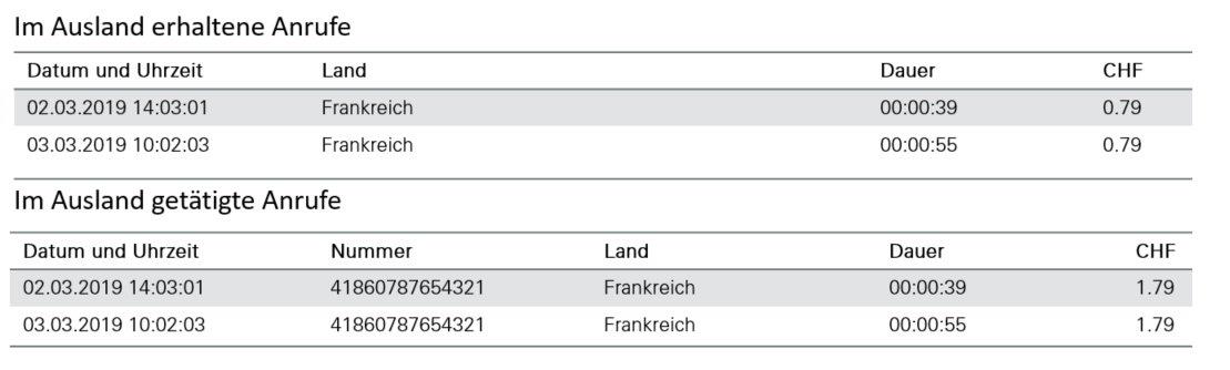 Auf Seite 3 sehen Sie alle Nutzungsdetails, ganz egal, ob die Kosten in Ihrem Abo inbegriffen sind oder nicht. Wenn Sie Ihre Rechnung per E-Mail erhalten, bekommen Sie diese Seite automatisch – und zwar gratis. Wenn Sie Papierrechnungen bekommen, können Sie sich entscheiden, ob Sie diese Nutzungsdetails für CHF 5.- pro Monat erhalten möchten.